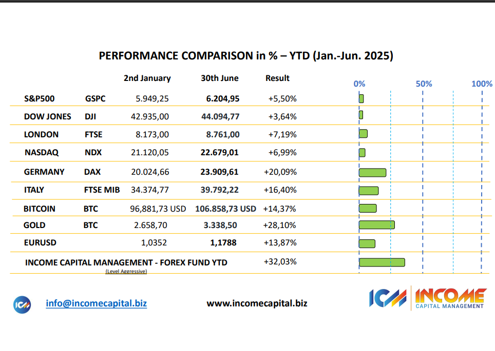 Navigating Storms, Delivering Solid Results: Our First Half of 2025 The first half of 2025 has tested investors worldwide. Geopolitical tensions, persistent inflationary pressures, and volatile global markets have created an environment where consistency has been difficult to achieve and true outperformance even harder. Yet it is precisely during these phases that disciplined investment strategies reveal their value. A Market Environment Defined by Complexity The past six months can reasonably be described as a period of global instability. Financial markets have had to absorb overlapping shocks β from geopolitical uncertainty and shifting monetary policies to sudden changes in risk sentiment. In such an environment, remaining invested is not enough. Navigating volatility requires clarity of process, disciplined execution, and the ability to distinguish noise from structural opportunity. Performance That Reflects Method, Not Momentum At Income Capital Management, we do not aim to react to markets β we aim to understand them, structure around them, and outperform them through disciplined strategy. As we close the first half of 2025, the results of this approach are clearly visible: June 2025: +3.45% Q2 2025: +12.00% Year-to-Date (JanβJun 2025): +32.03% Cumulative since April 2024: +62.08% These figures refer to the Aggressive Investment Level of our flagship Forex strategy. As always, it is important to note that past performance is not indicative of future results. Why These Results Matter Outperformance in a strong market can be attributed to momentum. Outperformance in a fragile and uncertain market, however, reflects structure, risk control, and execution. Our results are the outcome of: A proprietary FX strategy built on active market analysis Disciplined risk management and exposure control Flexibility in adapting to rapidly changing market conditions Continuous focus on capital protection alongside return generation While many investors struggled to remain invested amid volatility, our strategy maintained coherence and direction. Conviction Over Noise Periods dominated by political headlines, central bank speculation, and short-term market reactions often tempt investors to abandon strategy in favor of emotion. We believe the opposite approach is required. In complex environments, capital seeks conviction, consistency, and process β not narratives. This philosophy has guided our decisions throughout the first half of 2025 and continues to shape our outlook for the months ahead. A Message to Investors To our investors, we extend our sincere appreciation for your continued trust. Your confidence allows us to execute strategies with discipline and long-term perspective. For those observing from the sidelines, this period serves as a reminder that sustainable performance is built through method, not speculation. A performance comparison chart related to this update is available on LinkedIn at the following link: View the performance update on LinkedIn As markets continue to evolve, our commitment remains unchanged: protecting capital, managing risk, and delivering consistent, transparent results.