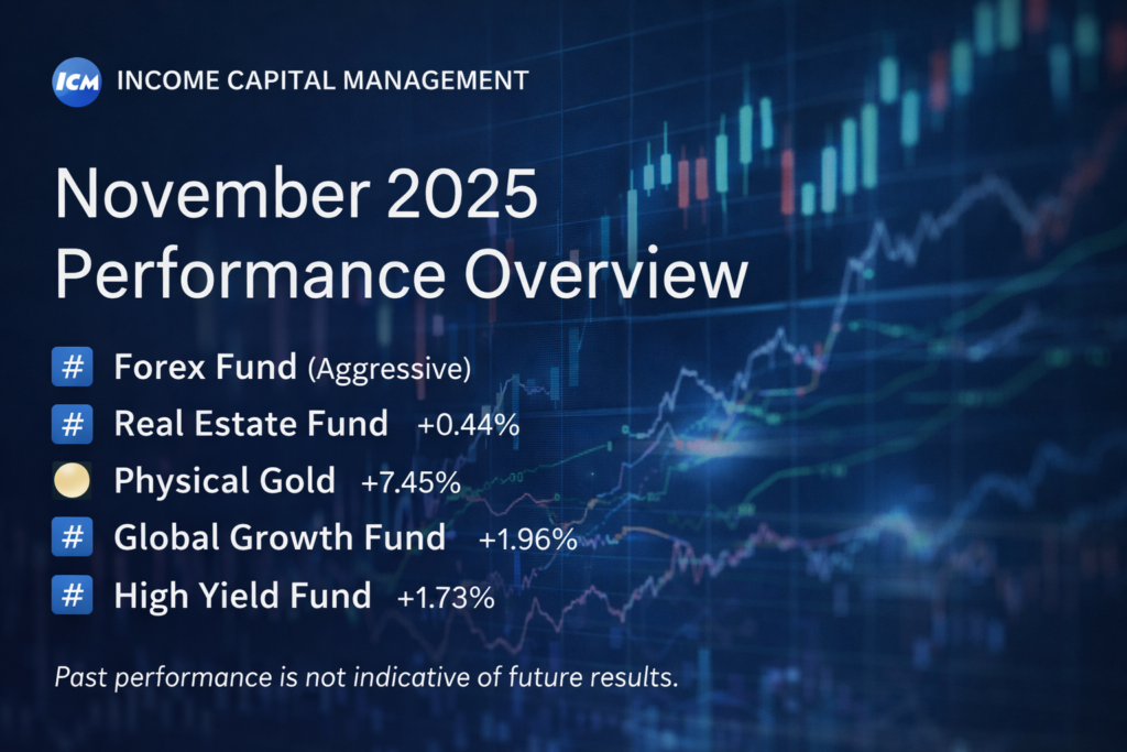 November 2025 – Portfolio Performance Overview Monthly performance reporting is not just about numbers. It is about understanding how different asset classes behave across varying market conditions and how disciplined portfolio construction supports consistency over time. Below is an overview of the performances of the main funds and assets managed by INCOME CAPITAL MANAGEMENT for November 2025, contextualized within the broader market environment. Forex Fund (Aggressive) November 2025: +2.00% January–November 2025: +32.71% Since April 2024: +62.76% In the final part of the year, a prudent and adaptive approach continued to support performance. Exposure was selectively reduced during more delicate market phases, allowing the strategy to remain responsive while protecting accumulated gains. This balance between opportunity and risk control remains a core element of the fund’s positioning. Real Estate Fund November 2025: +0.44% January–November 2025: +7.43% Since April 2024: +13.63% During November, the real estate market experienced a slight slowdown, a dynamic that is typical in periods characterized by reduced tourism and lower transactional activity. Despite this seasonal deceleration, the fund maintained stability thanks to sustained demand for quality properties located in prime areas, confirming the defensive characteristics of well-selected real estate exposure. Physical Gold Gold in custody: 13.45 Kg Market value as of 30/11/2025: €1,556,972 (€115.76 per gram) In November, gold recorded a strong appreciation, rising by more than 7% during the month. Since the beginning of 2025, cumulative growth exceeds 60%, reflecting persistent demand for defensive assets and the role of gold as a long-term store of value during periods of macroeconomic uncertainty. Global Growth Fund Total performance since 15/09/2025: +1.96% The initial months of activity have been positive, supported by selective exposure to innovative companies and high-potential sectors. The strategy focuses on long-term growth drivers while maintaining disciplined allocation criteria. High Yield Fund Total performance since 15/09/2025: +1.73% The fund’s launch phase has been supported by exposure to high-yield corporate bonds and REIT ETFs. Income generation is pursued within a diversified and risk-aware framework, aiming to balance yield opportunities with structural resilience. Final Considerations November’s results reflect a diversified portfolio structure designed to adapt across asset classes and market conditions. Consistency, selective exposure, and disciplined risk management continue to guide portfolio construction and execution. Full details are available in the private area under RESULTS: Access the private results area This content is provided for informational purposes only and does not constitute investment advice or a solicitation to the public. Past performance is not indicative of future results.